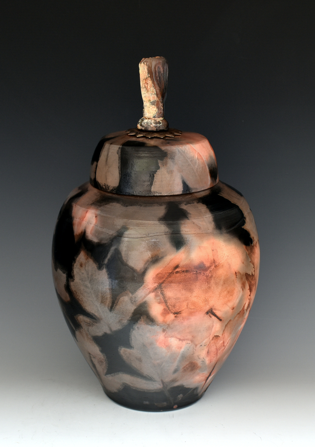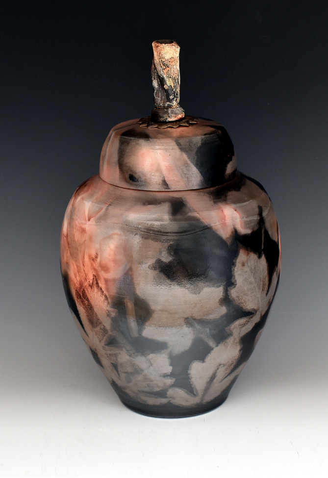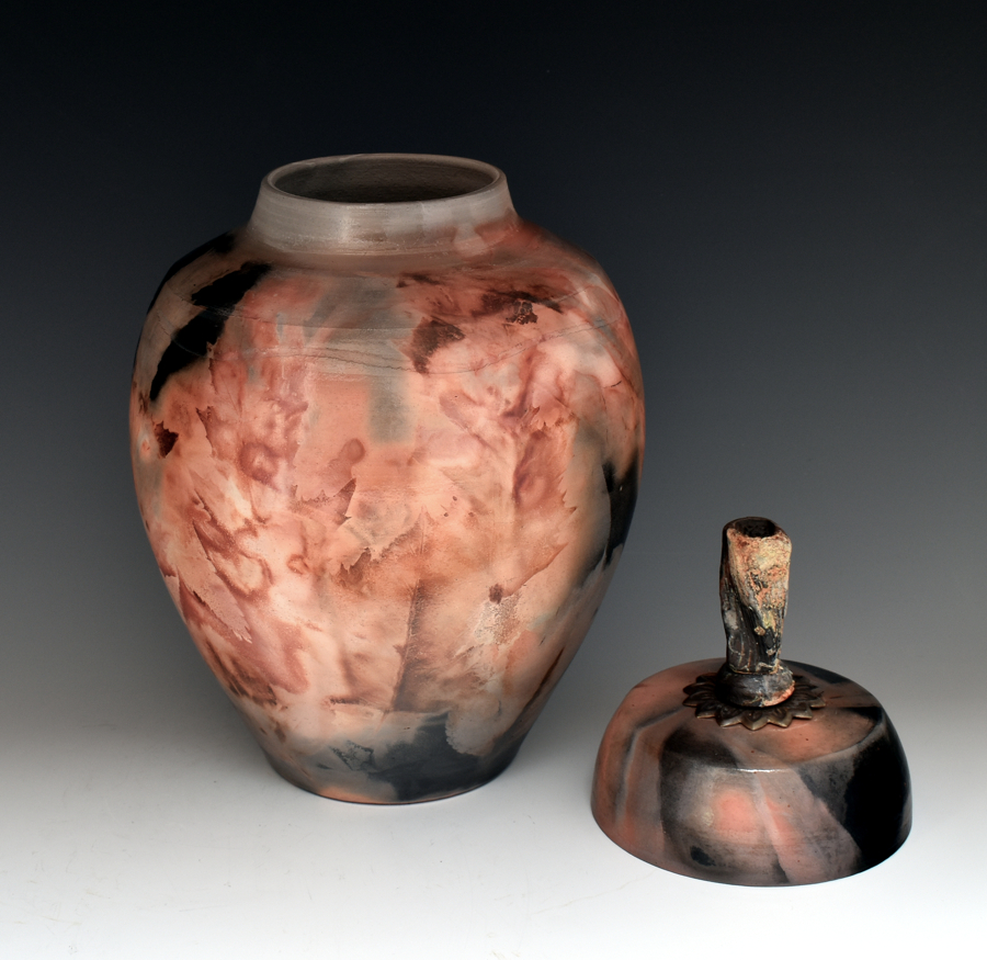 Saggar firing is a ceramic process in which the vessel is placed inside a sealed container along with combustible materials such as leaves, sawdust, straw, and more. The combustion chamber, when fired and sealed, produces a reaction with the materials to create a unique finish on the exterior of the urn.